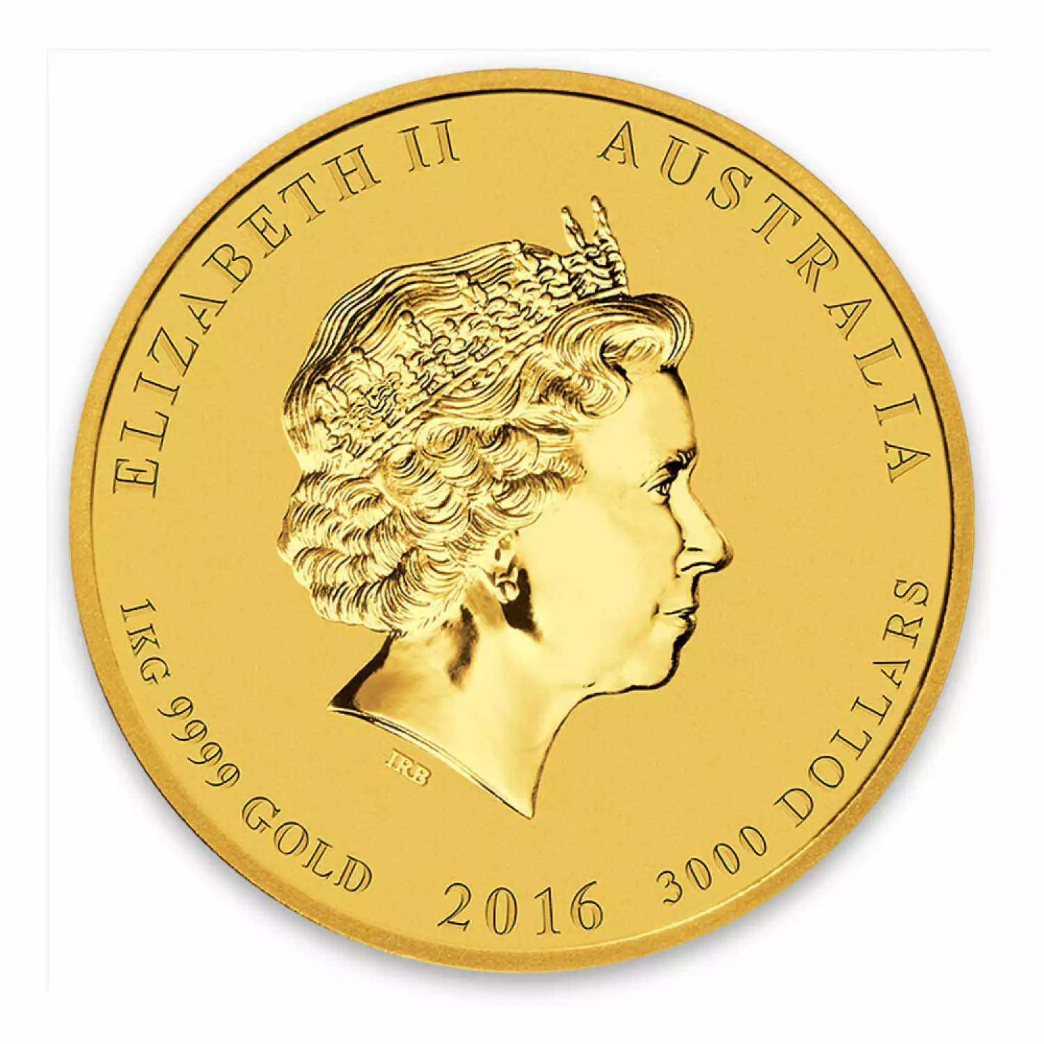 The 2016 10 oz Australian Perth Mint Gold Lunar II: Year of the Monkey contains 1kg of .999 pure gold. This bullion coin is backed and guaranteed by Federal Government of Australia.