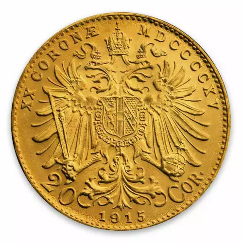The Obverse of the gold coin features a right facing bust of Franz Joseph I, emperor of Austria-Hungary, surrounded by the legend in Latin. These strikingly beautiful coins are struck by the Austrian Mint.