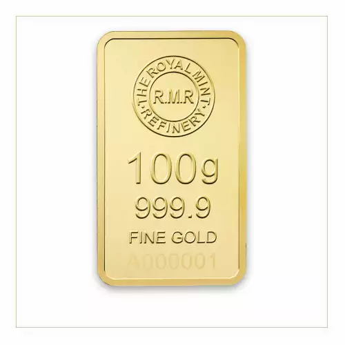 Each 100g Royal Mint Refinery Minted Gold Bar contains 100 gramsof .9999 gold, ideal for those looking to build an easily divisible portfolio. A larger gold bar tends to have a lower premium per troy ounce when purchasing given the relatively fixed cost of production being absorbed into a much larger gold bar.