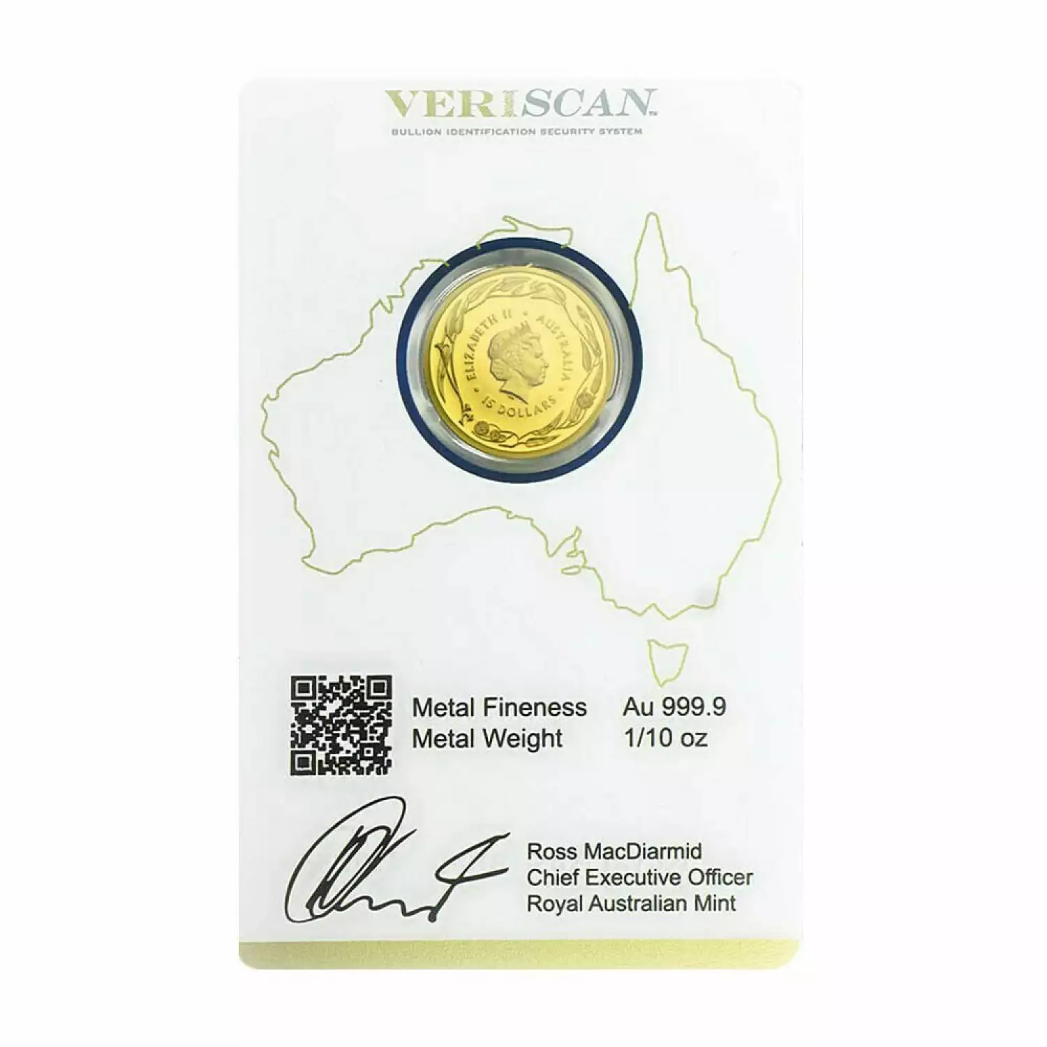 2016 Royal Australian Mint 1/10oz Kangaroo is made from 0.9999 fine gold with a weight of 1/10 troy oz and bears a face value of 10 AUD.